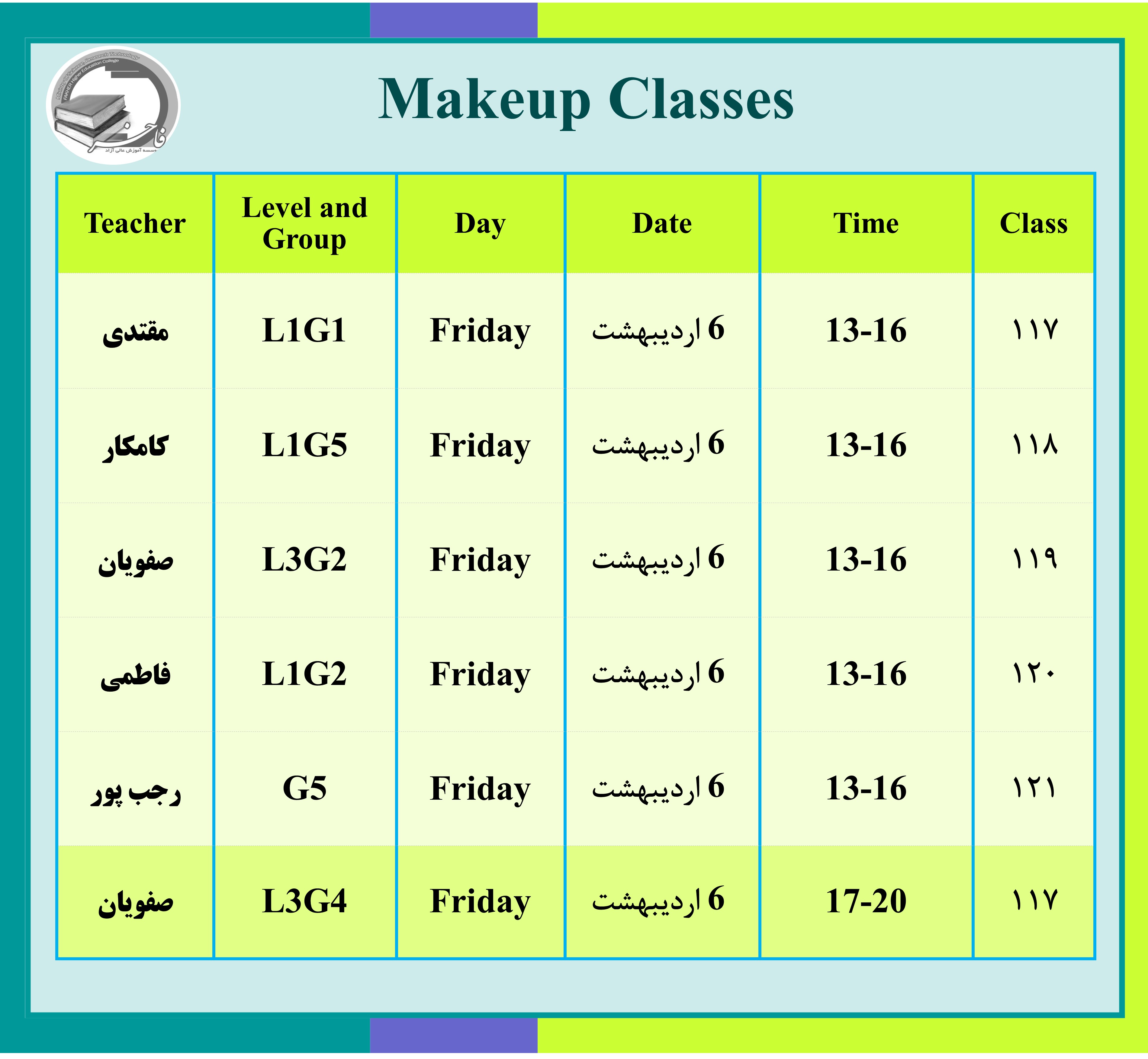 کلاس های جبرانی بهار 98 روز جمعه 6 اردیبهشت ساختمان قصردشت و ساختمان ارم